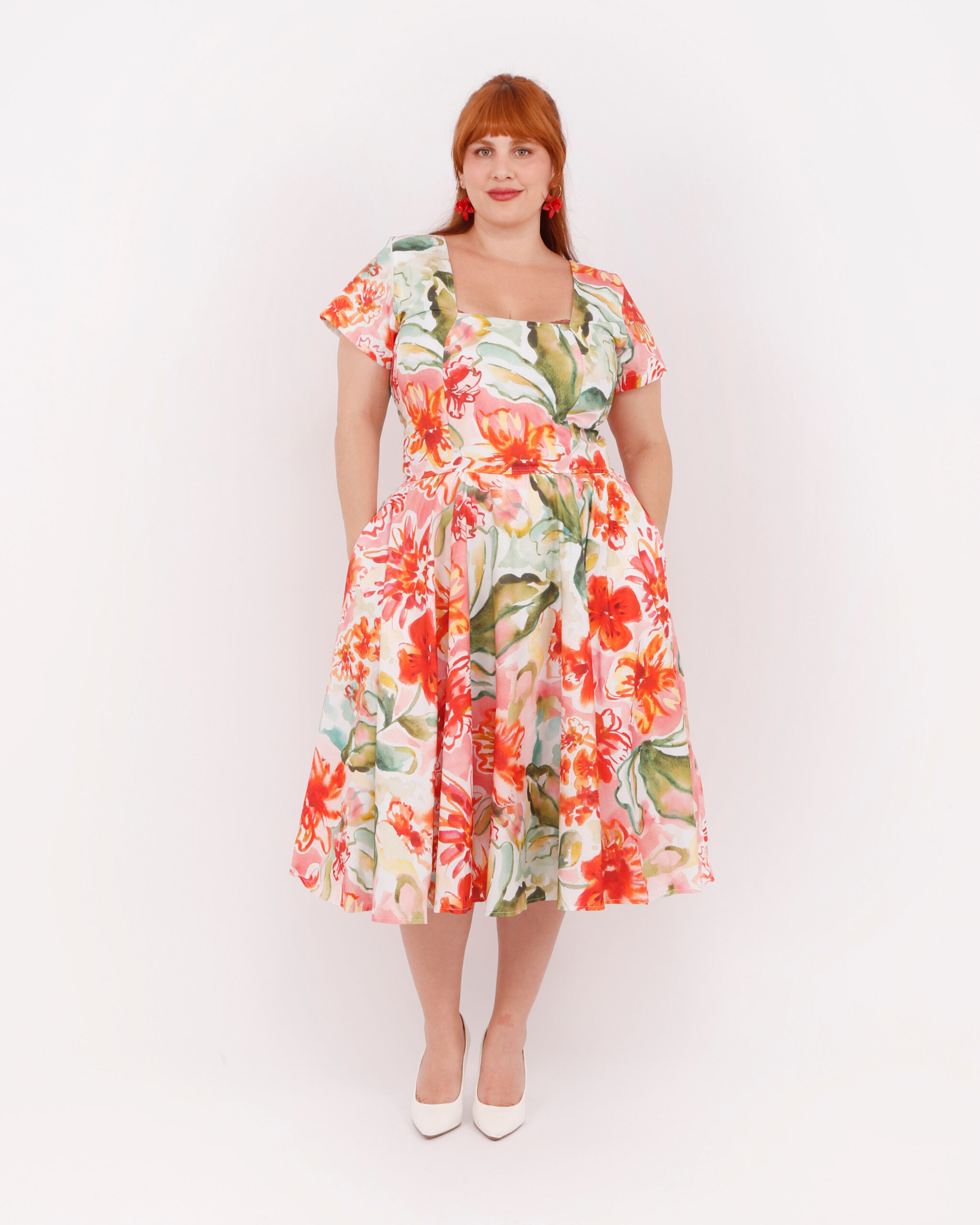 O Vestido Gode Algodão Floral Color da Delphina é a cara do verão!  Com estampa exclusiva e  modelagem que valoriza o corpo, a peça apresenta decote quadrado, lastex nas costas e elástico na cintura, além de saia godê, bolsos funcionais e forro completo. Dica: combine com sandálias de tiras ou anabelas e acessórios em fibras naturais para um look elegante e descontraído. Preço: R$ 399