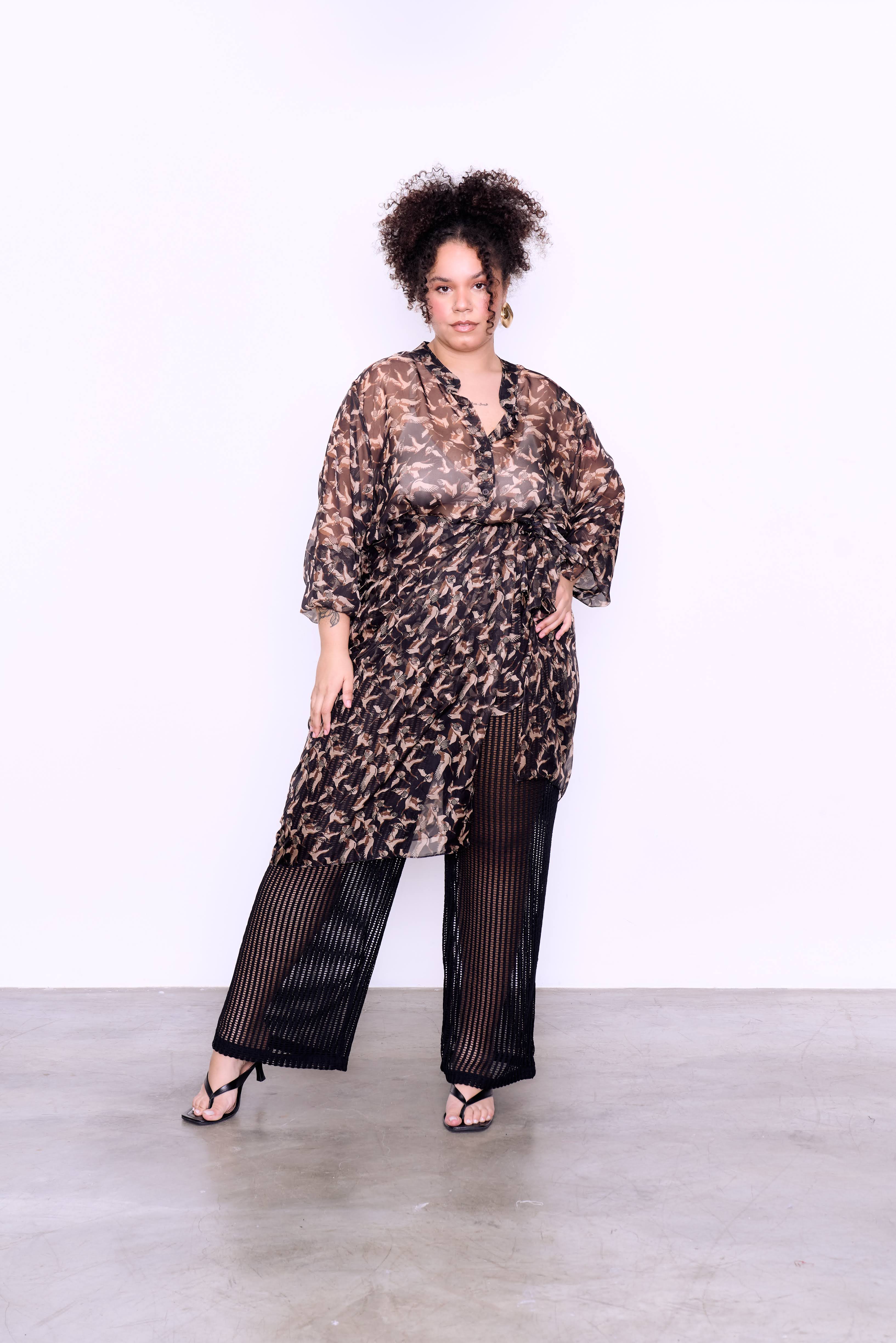 Camisa Oversized Preto Estampa Pássaro Plus Size produzida num tecido leve e macio, com transparência, sem elasticidade, gola padre, manga 7/8, punhos com elásticos, comprimento abaixo do quadril e fechamento por botões frontais. Preço: R$ 319